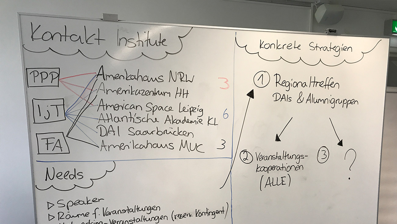 Nachdem man einander ausführlich die Organisationen vorgestellt hatte, fanden am Nachmittag Workshops statt. Um auch von Seiten des DAZ und anderer Amerikahäuser die Möglichkeit des dauerhaften Austauschs aufrecht zu erhalten, möchten die Vereine künftig eine gemeinsame Plattform nutzen. Gerade wegen der regelmäßigen Personalwechsel im Ehrenamt wäre eine strukturierte Lösung sinnvoll. Des Weiteren fand man heraus, wer von den Vereinen bereits Kontakte mit Amerikahäusern in Deutschland hat. Dabei ist eine regionale Vernetzung ausschlaggebend. So möchten alle Anwesenden künftig gemeinsame Veranstaltungen planen oder an den Veranstaltungen der anderen Partner teilnehmen.